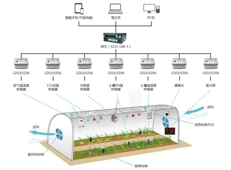 以生態(tài)溫室為例,隨著遠程監(jiān)控系統(tǒng)、無線傳感器監(jiān)測等技術(shù)日趨成熟,物聯(lián)網(wǎng)、大數(shù)據(jù)等技術(shù)已逐步應(yīng)用到了生態(tài)農(nóng)業(yè)建設(shè)中。通過環(huán)境、動植物信息檢測,溫室農(nóng)業(yè)大棚信息檢測和標準化生產(chǎn)監(jiān)控,精準農(nóng)業(yè)中的節(jié)水灌溉等應(yīng)用模式,提高了農(nóng)業(yè)生產(chǎn)的管理效率、提升了農(nóng)產(chǎn)品的附加值、加快了智慧農(nóng)業(yè)的建設(shè)步伐。其主要方式通過安裝于指定的監(jiān)測點的空氣溫濕度傳感器、土壤溫濕度傳感器、土壤PH傳感器、光合有效輻射傳感器、CO2傳感器等設(shè)備實時監(jiān)測空氣的溫濕度、二氧化碳濃度、土壤溫濕度及PH值等相關(guān)數(shù)據(jù);聯(lián)動控制系統(tǒng)由加熱、噴灌、通風(fēng)、卷簾設(shè)備及其配套PLC及Wifi設(shè)備服務(wù)器組成,當傳感器采集的環(huán)境數(shù)據(jù)與標準值對比超出臨界范圍時,控制器自動啟動相關(guān)硬件設(shè)備對作物生長環(huán)境加熱、澆水、通風(fēng)、卷簾加減光照輻射,實現(xiàn)作物生長過程精確控制。同時在塑膜日光溫室旁,建立地下沼氣池,沼氣池上方建圈舍及廁所,形成一個封閉的智慧化能源生態(tài)系統(tǒng)。在此系統(tǒng)內(nèi),圈舍溫度在冬天提高3~5℃,為禽畜提供了更適宜的生長條件,使豬的生長期大幅縮短約150天。禽畜糞便為沼氣池提供原料,產(chǎn)出的沼氣用于家庭供暖,殘留的沼渣、沼液作為溫室作物的肥料。此外,豬等禽畜呼吸排出的CO2可促進溫室內(nèi)作物光合作用,蔬菜產(chǎn)量和質(zhì)量明顯提高。