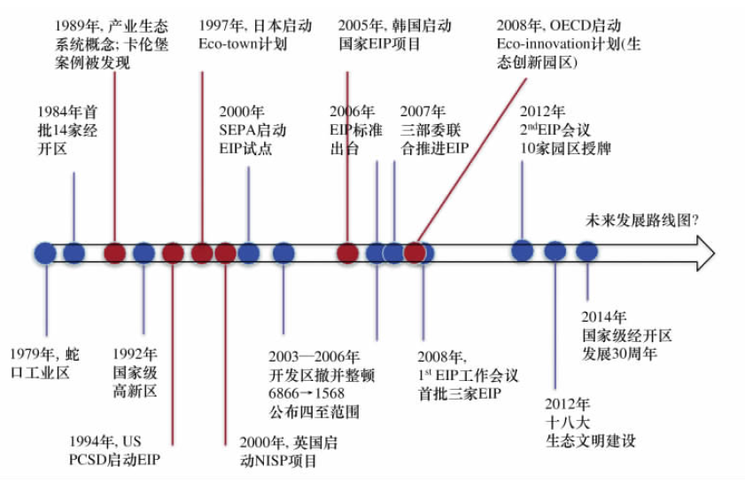 生態(tài)工業(yè)園區(qū)是產(chǎn)業(yè)生態(tài)學(xué)研究和實踐的重要載體之一。工業(yè)園區(qū)這一人工經(jīng)濟系統(tǒng)在發(fā)展中有意識地模仿自然生態(tài)系統(tǒng),應(yīng)用系統(tǒng)工程的理論和方法,對現(xiàn)有園區(qū)進行重新規(guī)劃、設(shè)計和建設(shè),以提高資源、能源利用效率,減少污染物產(chǎn)生和排放,改善環(huán)境質(zhì)量,促進經(jīng)濟持續(xù)發(fā)展。2000年以來,歐美國家、澳大利亞、日本、韓國、新加坡、印度、巴西等國家都出現(xiàn)了一系列關(guān)于生態(tài)工業(yè)園區(qū)案例的實證分析。工業(yè)發(fā)達國家生態(tài)工業(yè)園區(qū)發(fā)展的代表性例子包括丹麥、美國、英國、日本和韓國,下圖為幾個主要國家及中國推進生態(tài)工業(yè)園區(qū)發(fā)展的演變概覽。發(fā)達國家現(xiàn)階段關(guān)于生態(tài)工業(yè)園區(qū)發(fā)展的重點問題主要集中在以下方面:(1)生態(tài)化發(fā)展的驅(qū)動力,包括園區(qū)建立物質(zhì)、能量、信息、廢棄物等集成系統(tǒng)過程中潛在干系方之間建立合作聯(lián)系的驅(qū)動力;(2)生態(tài)化發(fā)展準則,目的是定義并識別推動生態(tài)化發(fā)展的創(chuàng)新行動(3)生態(tài)化發(fā)展成功要素,目的是從政治、經(jīng)濟、社會和環(huán)境識別各園區(qū)生態(tài)創(chuàng)新的成功要素;(4)定義針對推動園區(qū)生態(tài)創(chuàng)新有效發(fā)展和管理的關(guān)鍵問題。