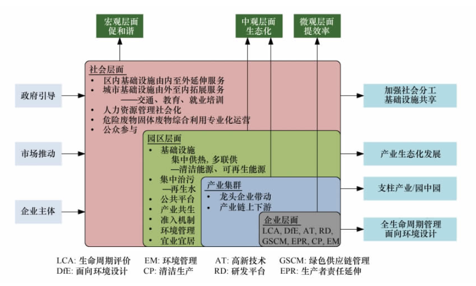 環(huán)保部組織出版了《中國生態(tài)工業(yè)園區(qū)建設(shè)模式與創(chuàng)新》,集中展現(xiàn)了多年以來國家生態(tài)工業(yè)示范園區(qū)的建設(shè)模式、特色與成效,總結(jié)梳理了一系列典型案例,并從6個方面凝練出現(xiàn)階段國家生態(tài)工業(yè)示范園區(qū)的主要建設(shè)模式,包括(1)企業(yè)層面以生態(tài)設(shè)計、綠色技術(shù)、節(jié)能降耗、環(huán)境管理為抓手推動生態(tài)化發(fā)展;(2)基于物質(zhì)代謝、水資源高效利用、能量梯級利用及基礎(chǔ)設(shè)施共享推進產(chǎn)業(yè)共生發(fā)展;(3)老工業(yè)基地向高新技術(shù)轉(zhuǎn)型、二三類產(chǎn)業(yè)協(xié)調(diào)融合發(fā)展,及傳統(tǒng)制造業(yè)向戰(zhàn)略性新型產(chǎn)業(yè)轉(zhuǎn)型促進產(chǎn)業(yè)轉(zhuǎn)型升級;(4)基于廢物循環(huán)利用的靜脈產(chǎn)業(yè)發(fā)展模式;(5)以流程工業(yè)為支柱且行業(yè)特征突出的園區(qū)集成創(chuàng)新實現(xiàn)資源能源高效利用;(6)在省會城市等大型城市布局的園區(qū)深化科技創(chuàng)新驅(qū)動生態(tài)產(chǎn)業(yè)發(fā)展。