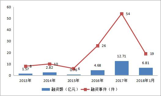 區(qū)塊鏈項(xiàng)目融資從2013年至2016年呈小幅上漲趨勢。由于2015年的政策監(jiān)管,導(dǎo)致2015年區(qū)塊鏈的投資熱度有所下降,在2017年VC大舉入局,投資額達(dá)12億。2018年1月,區(qū)塊鏈行業(yè)融資額和融資事件已經(jīng)超過2016年。