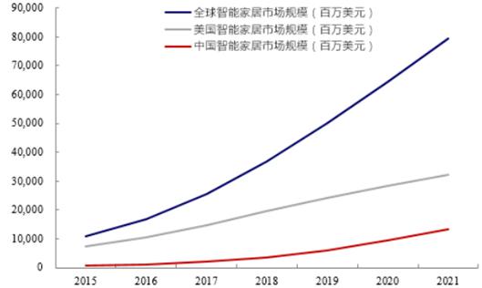 近年來智能家居市場進入快速拓展期,用戶滲透率快速增長。根據(jù)調(diào)查數(shù)據(jù)顯示,2017 年美國智能家居市場規(guī)模將達 146 億美元,滲透率提升至 32.5%,預(yù)計 2021 年將達到 60.7%。而中國智能家居市場規(guī)模也超過 20 億美元, 滲透率為 2.6%,與美國相比差距較大,未來發(fā)展空間廣闊。隨著語音識別技術(shù)不 斷成熟,智能音箱作為語音交互載體,在控制智能家居的便捷度和體驗上都將逐 步優(yōu)于智能手機。未來智能音箱有望成為智能家居的控制中樞,成為一個開放性的平臺,可以讓客廳的智能電視、電燈、空調(diào)等鏈接起來,通過語音交互來實現(xiàn)對于其他智能家居產(chǎn)品的控制,掌握了智能音箱便掌握了智能家居的入口。