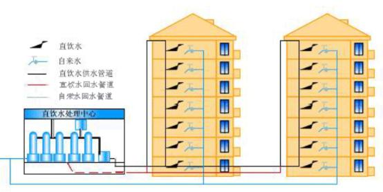 管道直飲水也稱分質(zhì)供水,興建于20世紀(jì)90年代中期,主要分布在人口較為集中的學(xué)校、醫(yī)院、商務(wù)樓宇、較高檔的小區(qū)。分質(zhì)供水是以自來(lái)水為原水,把自來(lái)水中生活用水和直接飲水區(qū)分開(kāi),另設(shè)管道直通住戶,實(shí)現(xiàn)飲用水和生活用水分質(zhì)、分流,達(dá)到直飲的目的。管道直飲水通過(guò)中央凈水設(shè)備在自來(lái)水提供的原水基礎(chǔ)上經(jīng)過(guò)再凈化過(guò)程提供給人們飲用,通過(guò)一些物理過(guò)濾、消毒殺菌等深度處理技術(shù)對(duì)自來(lái)水進(jìn)行進(jìn)一步處理,去除水中的有機(jī)物、重金屬、細(xì)菌、病毒等有害物質(zhì),滿足優(yōu)質(zhì)優(yōu)用、低質(zhì)低用的要求。