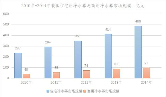 中國(guó)凈水器應(yīng)用市場(chǎng)主要是居民及商業(yè)凈水器市場(chǎng)。2014年國(guó)內(nèi)商用凈水器市場(chǎng)達(dá)到97億元,居民住宅凈水器市場(chǎng)規(guī)模達(dá)到488億元,同時(shí)住宅凈水器市場(chǎng)占比明顯大于商用凈水器市場(chǎng)。