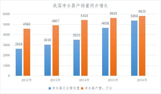 2012 年以來(lái),我國(guó)凈水器的產(chǎn)銷量逐年增長(zhǎng),市場(chǎng)需求不斷擴(kuò)大。2016 年,凈水器產(chǎn)量達(dá)到 1,347.8 萬(wàn)臺(tái),銷量為 1,353.4 萬(wàn)臺(tái)。從 2014 年開(kāi)始,凈水器產(chǎn)銷量增速雙雙放緩,市場(chǎng)進(jìn)入調(diào)整期。相對(duì)于整個(gè)家電行業(yè)而言,凈水器市場(chǎng)仍然維持著較高增速,市場(chǎng)潛力較大,競(jìng)爭(zhēng)激烈。