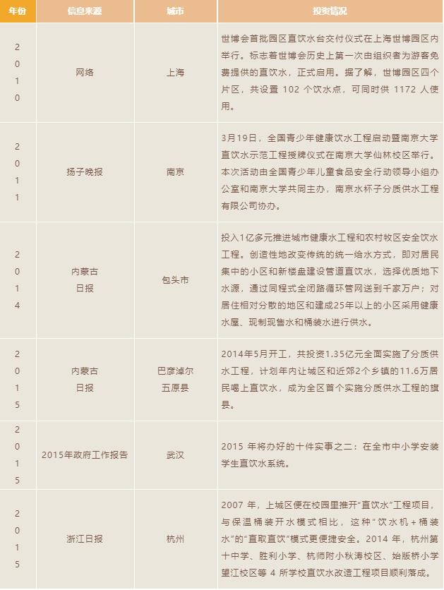 部分政府網(wǎng)站、媒體報(bào)道中各地區(qū)直飲水供水投資情況列表: