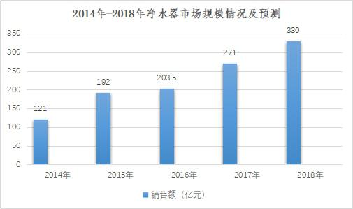 我國(guó)凈水器市場(chǎng)尚未完全開(kāi)發(fā),目前我國(guó)凈水器市場(chǎng)覆蓋率僅5%,而韓國(guó)的市場(chǎng)覆蓋率高達(dá)95%。這其中,蘊(yùn)含著巨大的商機(jī),未來(lái)凈水器市場(chǎng)可以發(fā)展成上千億乃至更多的產(chǎn)業(yè)。根據(jù)中商產(chǎn)業(yè)研究院發(fā)布的《2018-2023年中國(guó)凈水器市場(chǎng)前景及投資機(jī)會(huì)研究報(bào)告》數(shù)據(jù)顯示,2016年中國(guó)凈水器銷售規(guī)模為203.5億元,同比增長(zhǎng)40.6%;2017年中國(guó)凈水器市場(chǎng)規(guī)模達(dá)271億元,同比增長(zhǎng)33.2%,其中線上可達(dá)213億元,線下可達(dá)58億元。同時(shí),在2018年中國(guó)凈水器銷售規(guī)?;?qū)⑼黄?30億元。