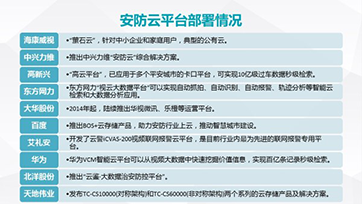 當(dāng)前平安城市和智慧城市的建設(shè)中,智能化分析已經(jīng)得以大量應(yīng)用,大量實(shí)例證明智能化分析在城市視頻監(jiān)控中的必要性。但目前安防,智能化不足是安防行業(yè)的主要頑疾之一,更加智能化將是未來(lái)發(fā)展方向和創(chuàng)新點(diǎn)。 另一方面,平安城市和智慧城市建設(shè)的重心已經(jīng)從前端的攝像頭等硬件設(shè)備向后端聯(lián)網(wǎng)平臺(tái)系統(tǒng)轉(zhuǎn)移。未來(lái)云平臺(tái)將成為安防企業(yè)競(jìng)爭(zhēng)的核心。多家企業(yè)已開(kāi)始布局安放云平臺(tái)通過(guò)云平臺(tái)可以引申出一系列配套的產(chǎn)品、服務(wù)和解決方案,未來(lái)平臺(tái)建設(shè)能力較強(qiáng)的廠(chǎng)商可通過(guò)將平臺(tái)免費(fèi)提供給用戶(hù)使用,而由于平臺(tái)轉(zhuǎn)換成本高,這將大大增加用戶(hù)的使用粘性。