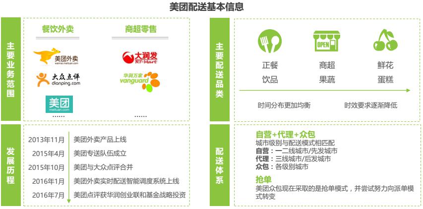 2017年初,美團外賣配送日訂單量已經(jīng)超過900萬單,美團配送團隊完成的訂單比例逐步提升,配送能力日漸增強?;诿缊F外賣入駐商家類型的多元化,美團配送的品類也在不斷擴展。為快速開拓三四線城市的市場,美團外賣采用“自建+加盟代理+眾包”的運力組織形式,適應不同市場的需要。
