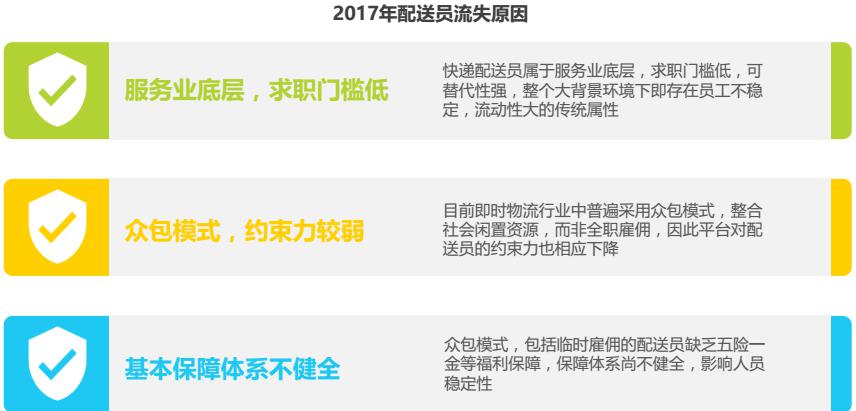 維持穩(wěn)定的配送員團隊,對于配送平臺的發(fā)展至關(guān)重要。但目前即時物流行業(yè)存在配送人員流失率高的難題。究其原因,存在以下三方面的因素:求職門檻低、可替代性強,平臺對人員的約束力較弱以及基本保障體系不健全。