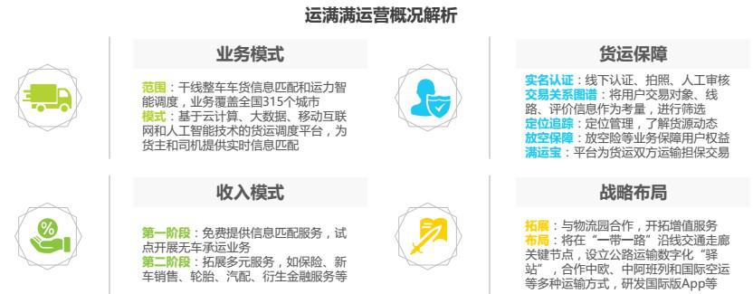 運滿滿成立于2013年,是基于云計算、大數(shù)據(jù)、移動互聯(lián)網(wǎng)和人工智能技術(shù)開發(fā)的貨運調(diào)度平臺,為貨主和司機提供實時信息匹配,減少貨運空載率、提高物流運行效率。由于模式相近,運滿滿被業(yè)界稱為“貨運版的滴滴”,成立3年來共獲得7輪融資,目前估值超過10億美金。截止2017年9月底,平臺實名注冊重卡司機400余萬、貨主100余萬,業(yè)務覆蓋全國 315 個城市。運滿滿最新推出擔保交易產(chǎn)品“滿運寶”,為貨運雙方提供運費擔保。此外,運滿滿還與阿里云、菜鳥、螞蟻金服、平安保險、中國聯(lián)通、中國重汽等開展深度戰(zhàn)略合作,通過跨界融合,不斷推出創(chuàng)新產(chǎn)品和服務。未來,運滿滿將借助人工智能、無人駕駛、區(qū)塊鏈等技術(shù)驅(qū)動,提供貫穿全產(chǎn)業(yè)鏈的線上線下服務,構(gòu)建公路物流生態(tài)圈,打造綜合性的貨運平臺。