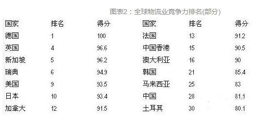 國家的物流業(yè)總體競爭力不僅取決于基礎設施建設水平,還取決于整個物流產(chǎn)業(yè)的管理水平、第三方物流企業(yè)發(fā)展水平和第四方物流企業(yè)的整合能力。從國家層面來看,世界銀行發(fā)布的報告顯示,在全球物流業(yè)競爭力排行榜(Logistics Performance Index)中,歐洲國家表現(xiàn)最為突出,前20名中超過60%的企業(yè)來自歐洲,亞洲物流業(yè)競爭力最強的國家/地區(qū)是日本(排名第十),其次為中國香港和臺灣地區(qū),中國大陸在全球僅排名第28??傮w而言,發(fā)展中國家在基礎設施、國際運輸、物流能力、交貨及時性等方面還與歐美等發(fā)達國家存在較大的差距,物流業(yè)的全球競爭能力還十分有限。