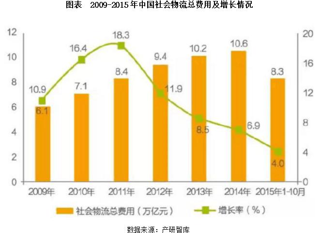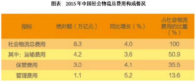 2014年社會物流總費用10.6萬億元,同比增長6.9%。社會物流總費用與GDP的比率為16.6%,比上年下降0.3個百分點。其中,運輸費用5.6萬億元,同比增長6.6%,占社會物流總費用的比重為52.9%;保管費用3.7萬億元,同比增長7.0%,占社會物流總費用的比重為34.9%;管理費用1.3萬億元,同比增長7.9%,占社會物流總費用的比重為12.2%。