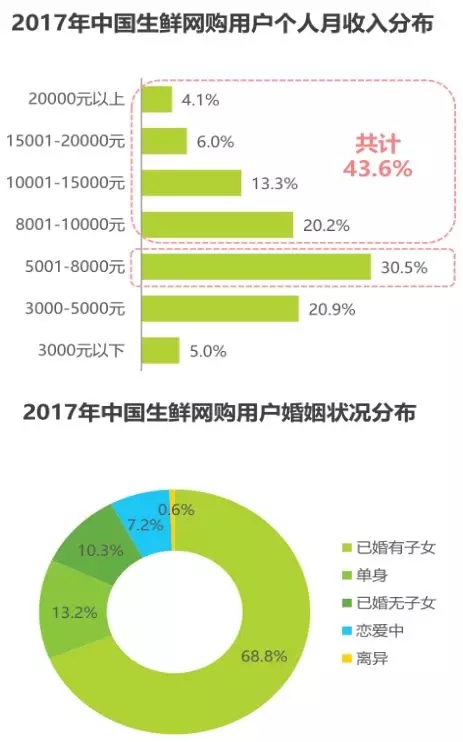 從用戶屬性來看,體驗過創(chuàng)新模式的用戶中高學歷、高家庭月收入的人群占比均高于整體生鮮網購用戶,與創(chuàng)新模式中高端消費者的定位相吻合。體驗過創(chuàng)新模式的用戶中78.2%擁有大學本科及以上學歷,80.7%的用戶家庭月收入在10000元以上,其中家庭月收入在10001-15000元的用戶最多,占比達28.2%。