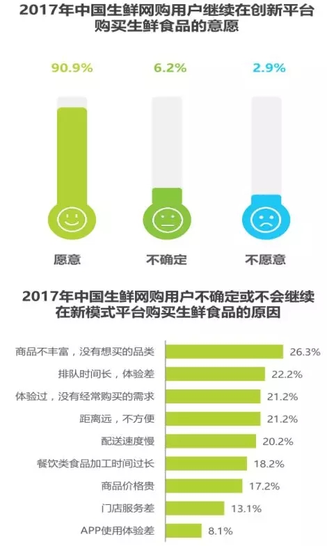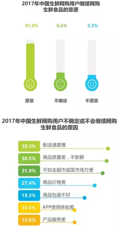 九成以上用戶愿意繼續(xù)網購生鮮食品,配送速度慢和品質問題是用戶不確定或不會繼續(xù)購買的主因。