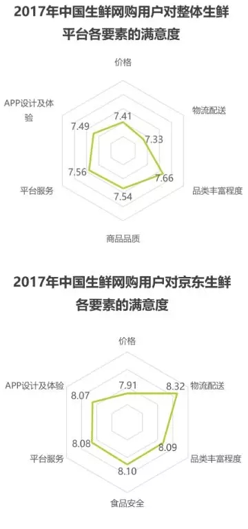 艾瑞調研數據顯示,生鮮網購用戶對整體生鮮網購各個要素的滿意度均在7分以上,對品類豐富程度的滿意度最高,平均分為7.66分。從京東生鮮與行業(yè)整體對比來看,其各個細分維度的滿意度均高于行業(yè)整體,物流配送方面的優(yōu)勢最為明顯:行業(yè)整體物流配送方面的評分較低,為7.33分;京東生鮮的物流得分則高達8.32分。