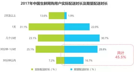 用戶期待更快速的配送體驗,45.5%的用戶希望配送時長在1小時內。