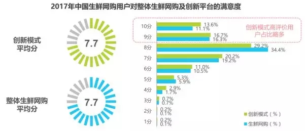 用戶對創(chuàng)新模式整體較為滿意,滿意度與整體生鮮網購基本持平,高評價用戶占比略多。