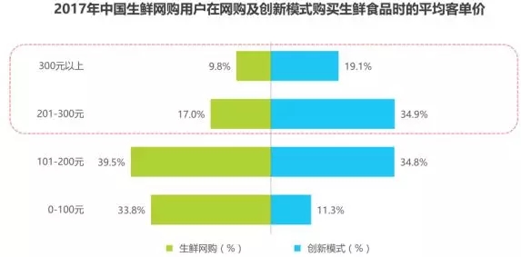 從消費金額來看,用戶在創(chuàng)新模式消費的單均價明顯高于生鮮網購整體,超過50%的用戶在創(chuàng)新模式消費的單均價超過200元。其中,19.1%的用戶在創(chuàng)新模式消費單均價超300元,而這一比例在整體生鮮網購平臺僅9.8%。34.9%的用戶在創(chuàng)新模式的客單價在201-300元之間,僅有17.0%的整體生鮮網購用戶客單價在這一區(qū)間。