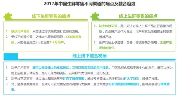 線上線下融合成生鮮電商發(fā)展重要趨勢;圍繞零售核心,優(yōu)勢痛點互補;各種渠道的融合是發(fā)展的必然趨勢。