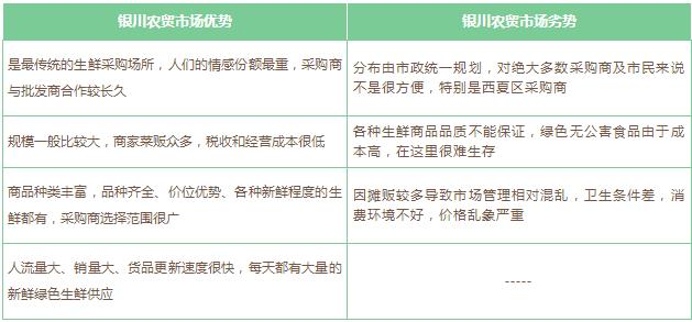 在銀川本地,主城范圍內除最早建立的北環(huán)批發(fā)市場外,再沒有專業(yè)的大型生鮮批發(fā)市場,近幾年發(fā)展起來的有:四季鮮果蔬批發(fā)市場、21世紀冷鏈批發(fā)市場、海吉星農副產品物流園、潤恒農產品市場等都在郊區(qū)。大型農產品交易市場是傳統(tǒng)生鮮流通中不可缺少的一環(huán),是各社區(qū)農貿市場及超市生鮮尤其是蔬菜水果的主要來源,具有成交量大、知名度高、社會影響大、流通體系健全、配套完整等優(yōu)勢,但也存在傳統(tǒng)生鮮流通方式的不足。