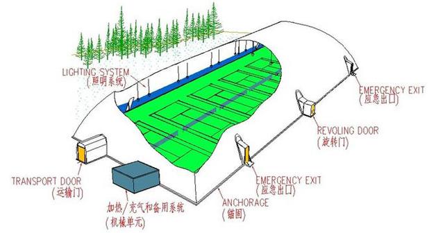 氣膜建筑也稱為“空氣支撐結(jié)構(gòu)”—air supported structure,是以特殊的建筑膜材為建筑外殼,并配備一套智能化的運(yùn)行控制系統(tǒng)為完全密閉的氣膜建筑內(nèi)部提供空氣壓力,使整體建筑內(nèi)部始終保持對外部環(huán)境的正壓,從而靠內(nèi)、外部壓力差把建筑主體支撐起來的一種建筑結(jié)構(gòu)系統(tǒng)。一套完整的氣膜建筑系統(tǒng)還包括了照明系統(tǒng)和門禁系統(tǒng)。