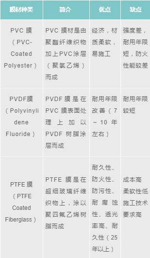 用于建筑膜結(jié)構(gòu)的膜材,依涂層材不同大致可分為PVC 膜、PVDF膜和PTEF 膜,膜材的正確選定應(yīng)考慮其建筑的規(guī)模大小、用途、形式,使用年限及預(yù)算等綜合因素后決定。