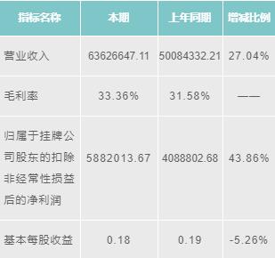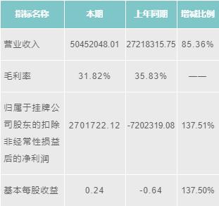 維拓環(huán)境2016年?duì)I業(yè)收入為50452048.01元,增長85.36%;毛利潤為31.82%;歸屬于掛牌公司股東的扣除非經(jīng)常性損益后的凈利潤為2701722.12元,增長137.51%;基本每股收益為0.24元,增長137.50%。